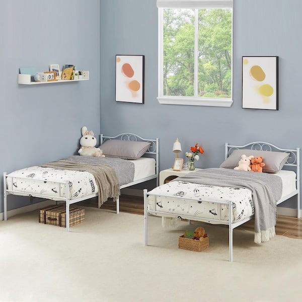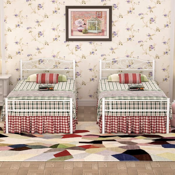 14 in. Twin Metal Bed Frame (Set of 2), Platform Bed with Headboard and Footboard, Heavy-Duty Steel Slats, White Beds