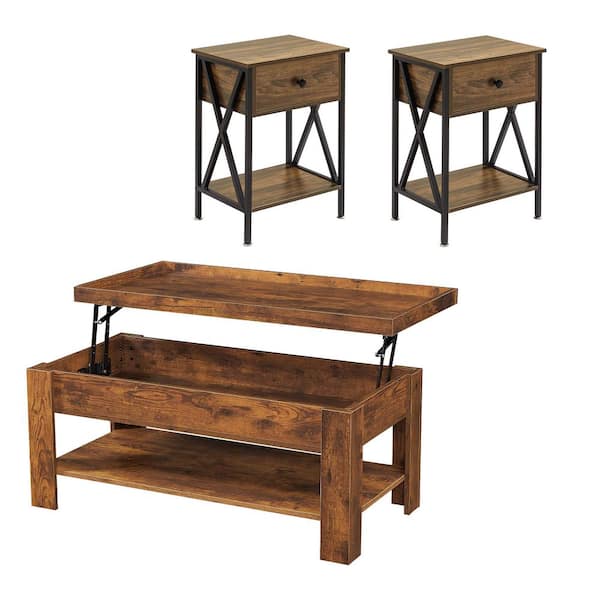 3-Piece Coffee Table Set 38.6 in. Brown Rectangle MDF Coffee Table with Lift-Top Table and 2 Matching Nightstands