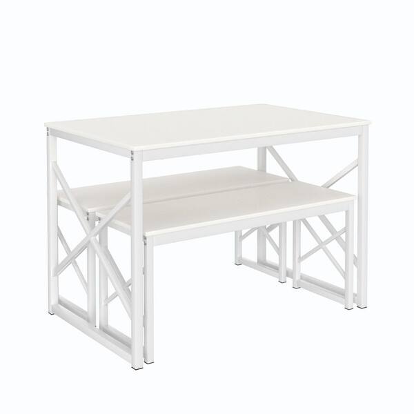 3-Piece Dining Table Set for 4,43.3 in. Kitchen Table with 2 Benches, Industrial Wood and Metal Dinette, White MDF Top