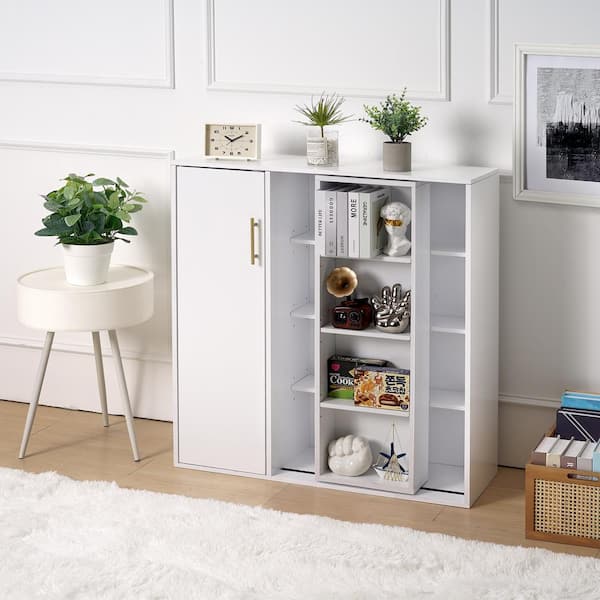 4-Tier White Storage Cabinet MDF 35.4 in. Freestanding Organizer with Side Door Adjustable Shelves Slim Design Sideboard