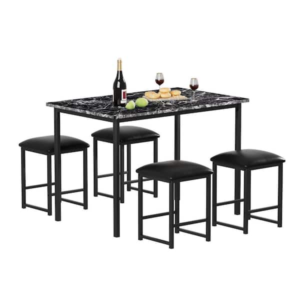 5-Piece Dining Table Set with Faux Marble MDF Top and 4 PU Padded Stools, Modern Kitchen Table Set for 4, Black