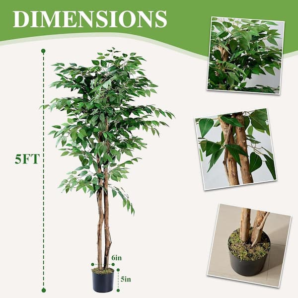5 ft. Artificial Ficus Tree, Green Faux Ficus Trees, Fake Silk Plant for Indoor Outdoor Home Office Decor, 1 Pack