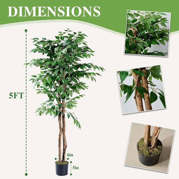 5 ft. Artificial Ficus Tree, Green Faux Ficus Trees, Fake Silk Plant for Indoor Outdoor Home Office Decor, 2 Pack