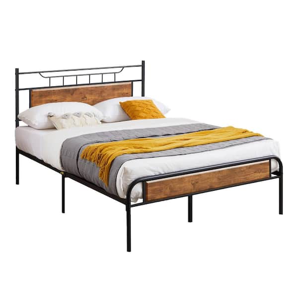 53.15 in. W Brown Full Size Metal Platform Bed with Wood Headboard and Footboard Easy Assembly Under Bed Storage