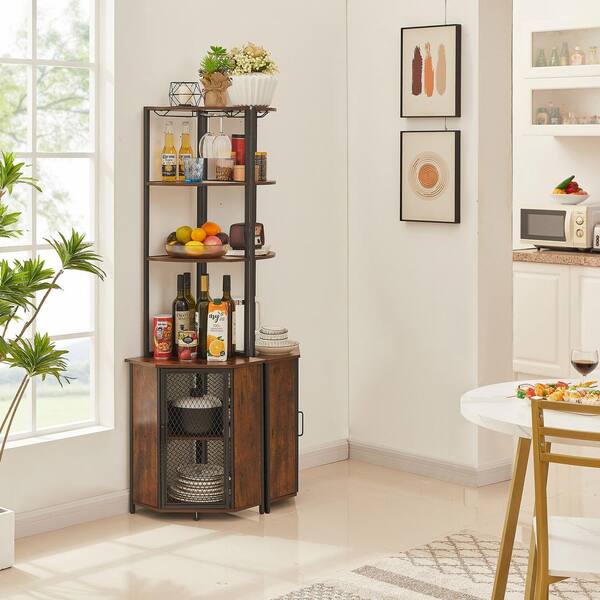 6-Tier Corner Shelf with Storage Cabinet, Tall Display Bookcase with Wine Glass Holder for Living Room, Brown