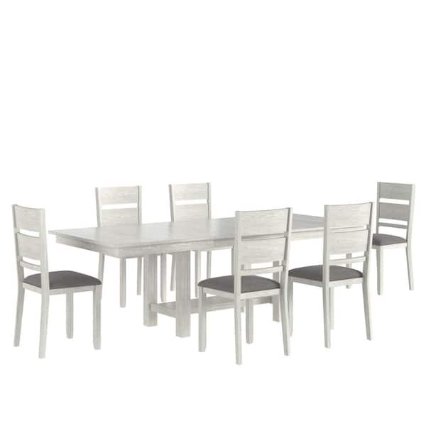 7-Piece Expandable Dining Table Set with 6 Upholstered Chairs, Gray Wood Farmhouse Style Dining Room Furniture Set for 6