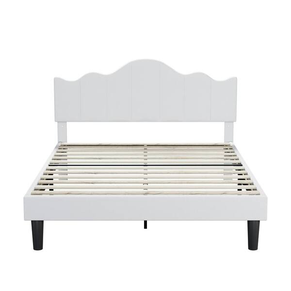 Adjustable Upholstered Bed White, Wood Frame Full Platform Bed with Noise-Free Wood Slat Support, No Box Spring Needed