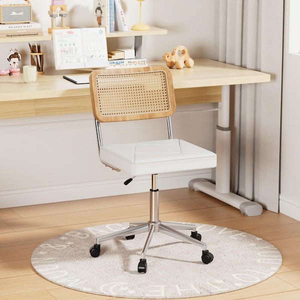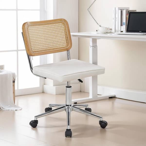 Armless Swivel Office Chair with Rattan Back and PU Seat - Adjustable White Desk Chair for Home Office or Vanity