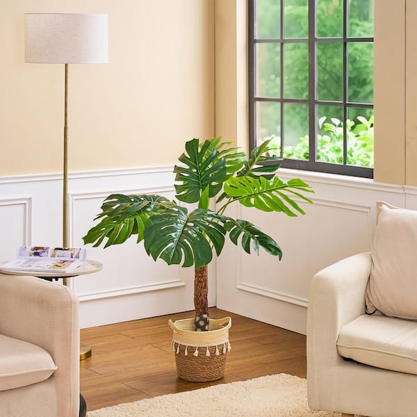 Artificial Plant 4 ft. Artificial Monstera Tree in Pot, Faux Swiss Cheese with Fake Bark and Moss, Indoor/Outdoor Decor