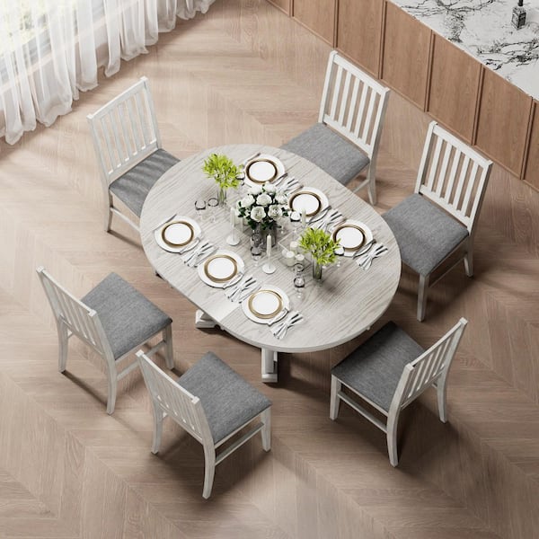 Extendable Round to Oval Dining Table Set with Cushioned Chairs, 7-Piece Solid Wood Top Kitchen/Dining Set for 6 Gray