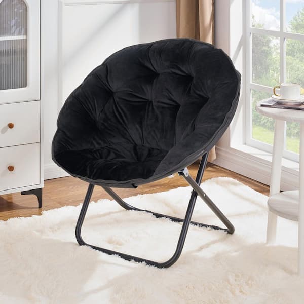Folding Moon Chair with Faux Fur Seat, Black Saucer Chair for Teens, Adults No-Assembly Accent Chair for Bedroom or Dorm