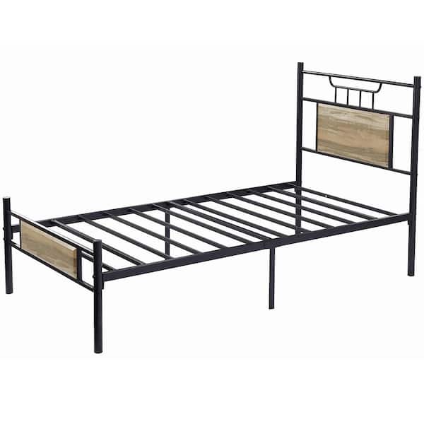 Industrial Bed Frame, Gray Metal Frame Twin Platform Bed with Wood Headboard and Footboard, Under Bed Storage