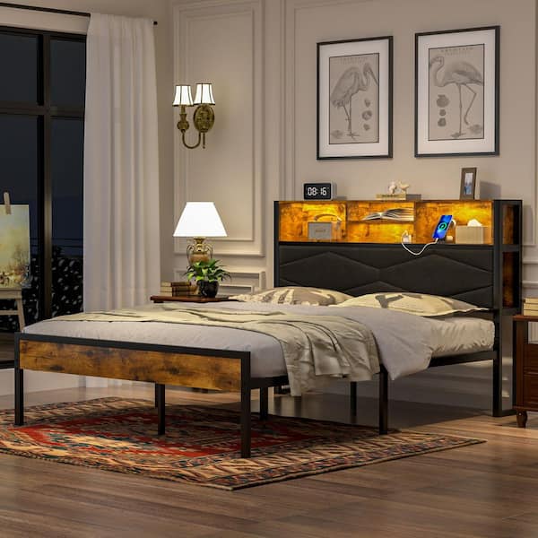 LED Bed Frame Brown Metal Frame Full Platform Bed with Charging Station, Storage Headboard, USB Outlets, Upholstered