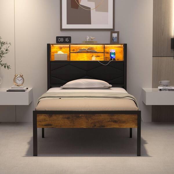 LED Bed Frame Brown Metal Frame Twin Platform Bed with Charging Station, Storage Headboard, USB and Outlets, Upholstered