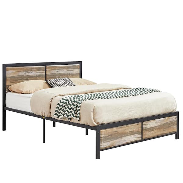 Metal Bed Frame Slate Brown Metal Frame Full Size Platform Bed with Rustic Country Style Wooden Headboard and Footboard