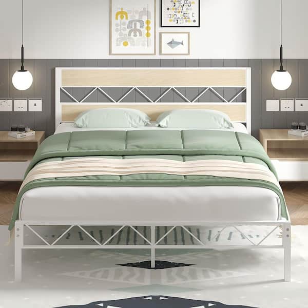 Metal Platform Bed Frame with Rustic Wooden Headboard, Heavy Duty Slats, Noise-Free, Easy Assembly White Full Bed Frame