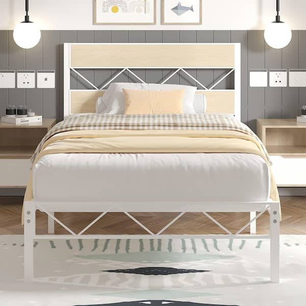 Metal Platform Bed Frame with Rustic Wooden Headboard, Heavy Duty Slats, Noise-Free, Easy Assembly White Twin Bed Frame