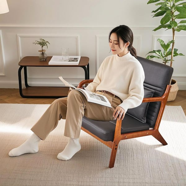 Modern Accent Chair, Solid Wood Frame, Black (Style 2) Upholstery, Comfortable Lounge Chair with 1 Pillow Set of 2