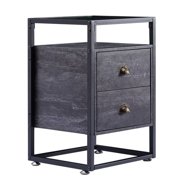 Nightstands, Modern Tempered Glass End Table with 2-Drawers and Rustic Shelf, Charcoal Gray, 15.7 in. D