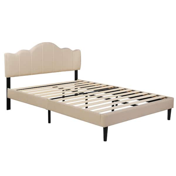Platform Bed Frame, Beige Metal Frame Queen Size Platform Bed with Headboard Fabric Upholstered Wood Slat Support
