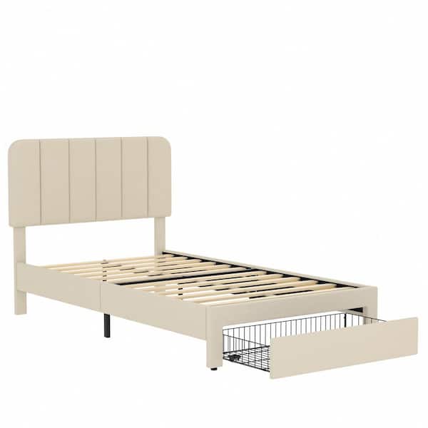 Platform Storage Bed Beige Metal Frame Twin Platform Bed with Velvet Upholstered Headboard and 1 Drawer