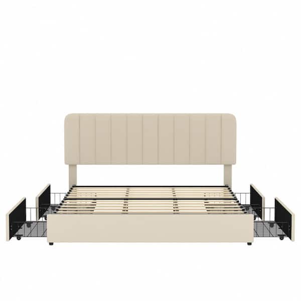 Platform Storage Bed Beige Metal + Wood Bed Frame King Platform Bed with Velvet Upholstered Headboard and 4-Drawers