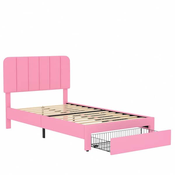 Platform Storage Bed Pink Metal Frame Twin Platform Bed with Velvet Upholstered Headboard and 1 Drawer