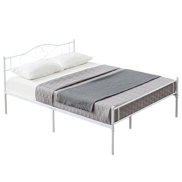 Queen Bed Frame, White Platform Bed No Box Spring Needed, Heavy Duty Steel Slats Support Bed