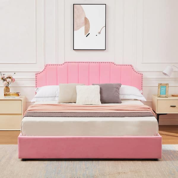 Queen Metal Platform Bed Frame with 4 Storage Drawers and Upholstered Headboard, Pink
