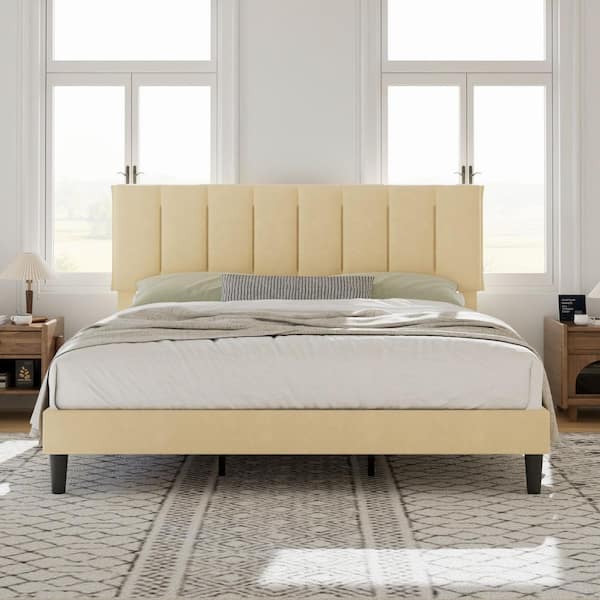 Modern Bed Frame, Beige Metal Frame King Platform Bed with Velvet Upholstered Headboard, Heavy Duty Bed Frame