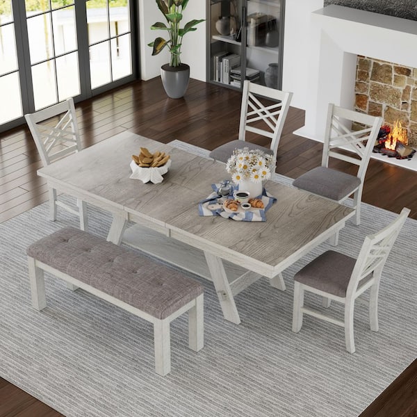 Rustic Farmhouse 6-Piece Dining Set - Extendable Table with Cross-Back Chairs and Padded Bench for Modern Homes