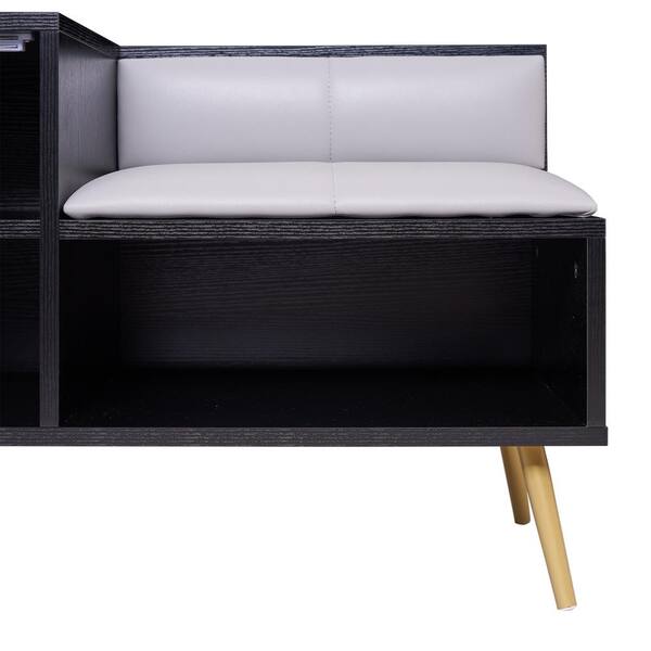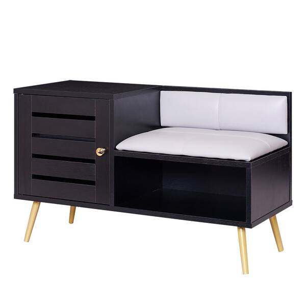 Shoe Storage Cabinet with Adjustable Shelf Entryway Bench Louvered Door Removable PU Seat Cushion and Backrest, Black