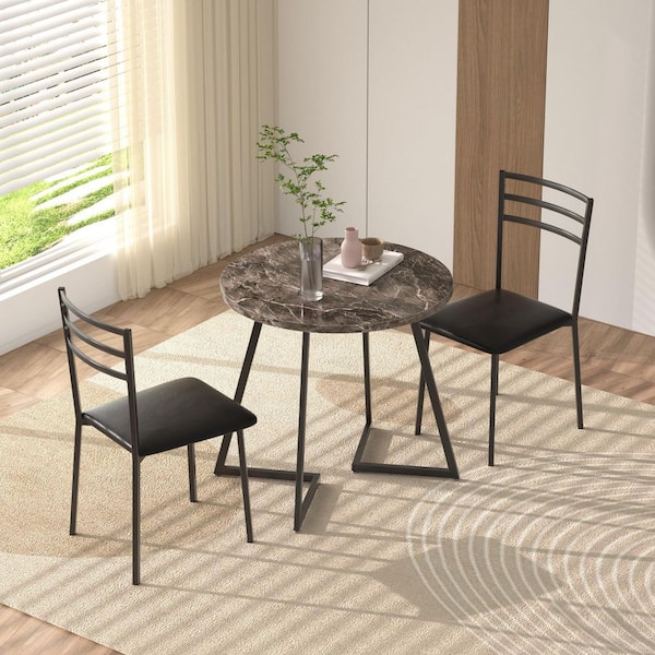 Small Round Dining Table (Set for 2) Modern Wood Tabletop & Metal Frame Ideal for Kitchen or Breakfast Nook, Marble Gray