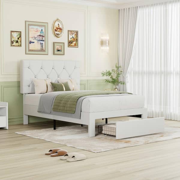 Twin Upholstered Storage Bed 1-Drawer, Platform Bed with White Faux Leather Tufted Headboard, Wood Slats Bed Frame