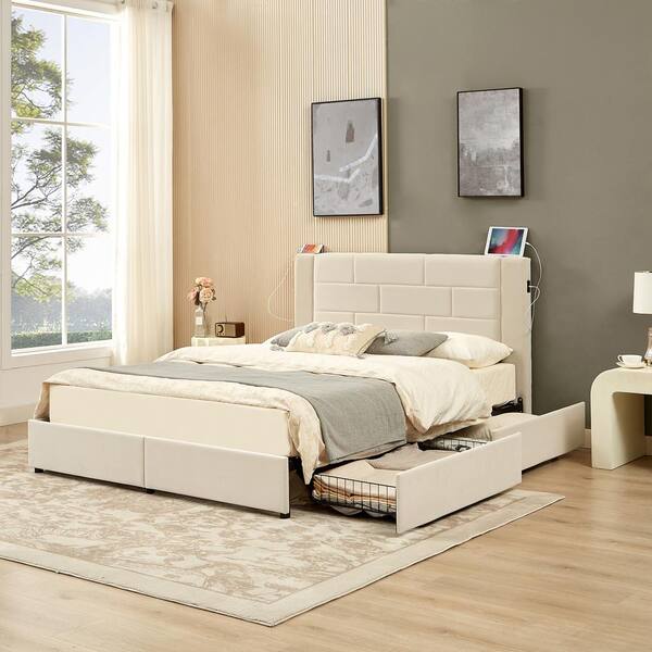 Upholstered Bed Beige Metal Frame Queen Platform Bed with USB Charging, Drawers and No Boxspring Needed, Easy Assembly