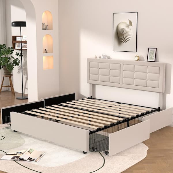 Upholstered Bed Frame Beige Metal Frame Queen Platform Bed with 4-Drawers, Headboard and Built-in USB and Type C Ports