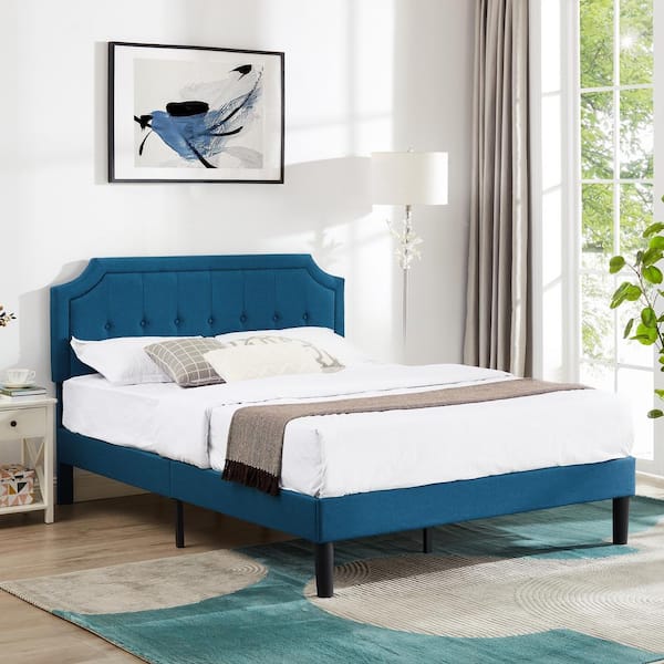 Upholstered Bed Frame ,Blue Metal Frame Full Size with Headboard Platform Bed with Sturdy Wood Slat Support
