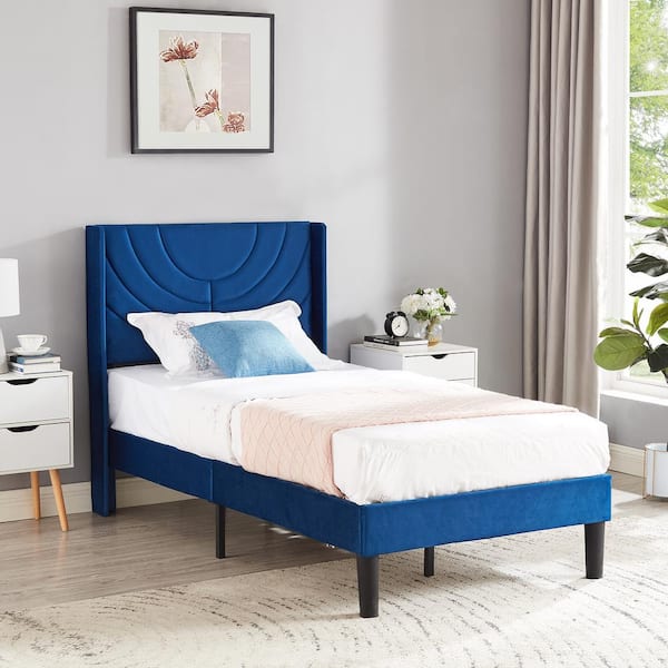 Upholstered Bed Frame Twin Blue Metal Bed Frame with Fabric Headboard, Wooden Slats Support