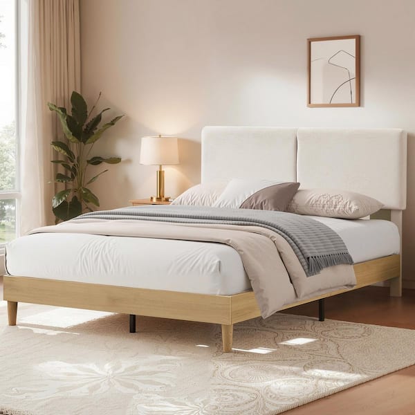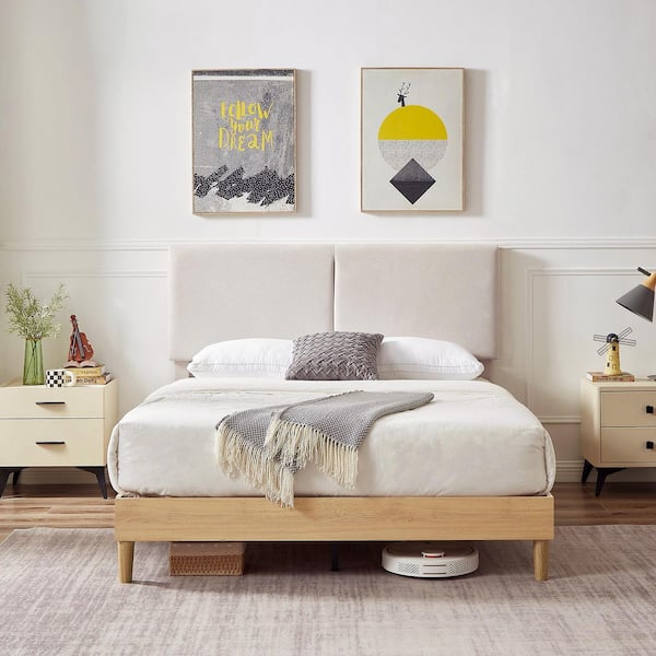 Upholstered Bed Frame with Linen Fabric Headboard, Strong Wood Slats Supports Platform Bed, Full Size Bed, Beige