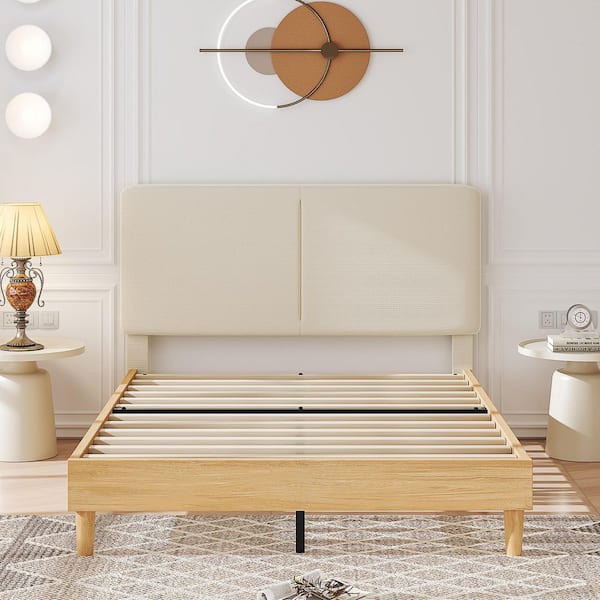 Upholstered Bed Frame with Linen Fabric Headboard, Strong Wood Slats Supports Platform Bed, Queen Size Bed, Beige