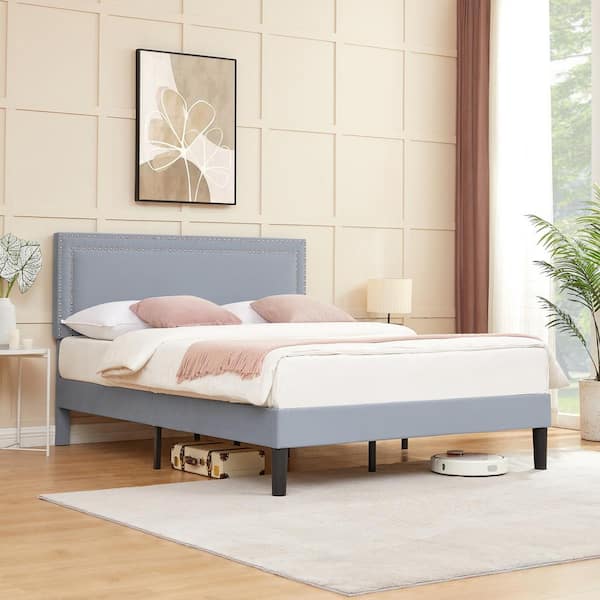 Upholstered Bed Gray Metal Frame Queen Platform Bed with Adjustable Headboard No Box Spring Needed Bed Frame
