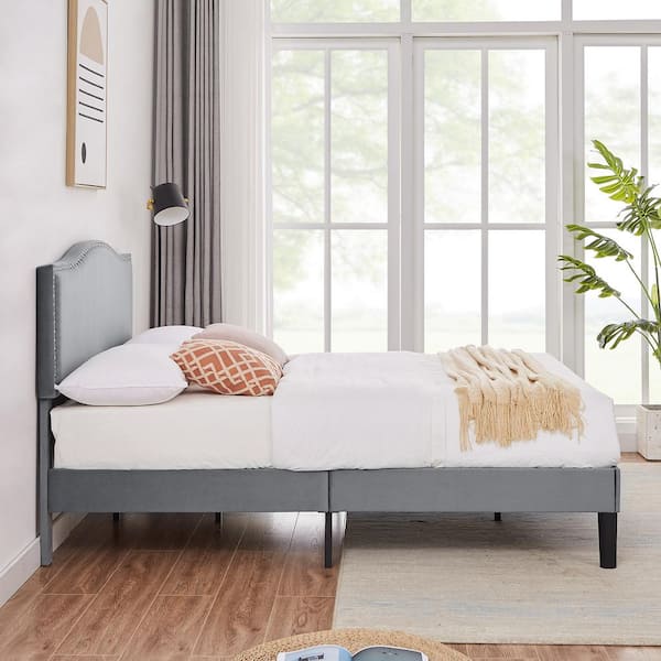 Upholstered Bed Gray Metal Frame Queen Platform Bed with Upholstered Headboard Strong Bed Frame and Wooden Slats Support