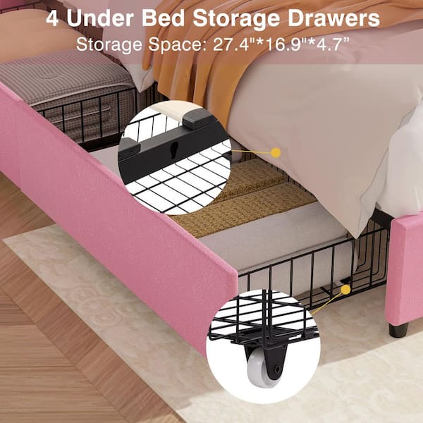 Upholstered Bed Pink Metal Frame Full Size Platform Bed with 4-Storage Drawers and Headboard, Wooden Slats Support