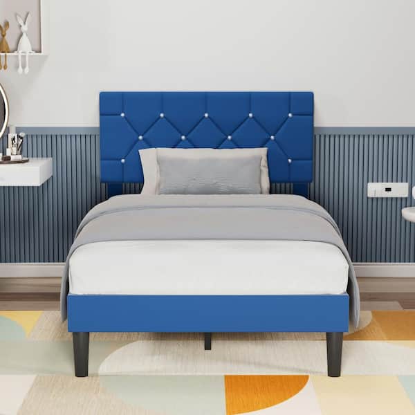 Upholstered Bed, Platform Bed with Adjustable Headboard, Wood Slat Support, No Box Spring Needed, Twin Blue Bed Frame