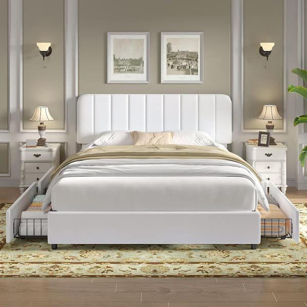 Upholstered Bed White Metal Frame Queen Size Platform Bed with 4-Storage Drawers and Headboard, Wooden Slats Support