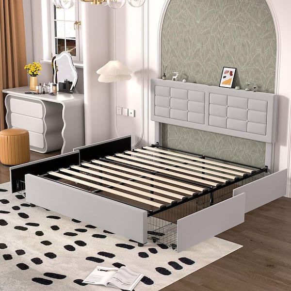 Upholstered Bed with 4-Drawers, Queen Bed Frame, Light Gray Platform Bed with Headboard, Built-in USB and Type C Ports