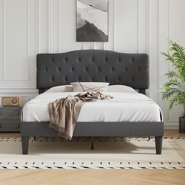 Upholstered Platform Bed with Button-Tufted Headboard Wood Slat Support Easy Assembly - Queen Dark Gray 62.8 in. W