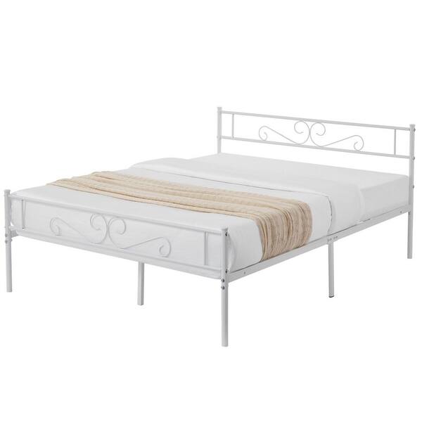 Victorian Bed Frame, White Metal Frame Queen Platform Bed No Box Spring Needed Heavy Duty Bed with Headboard, 63in. W
