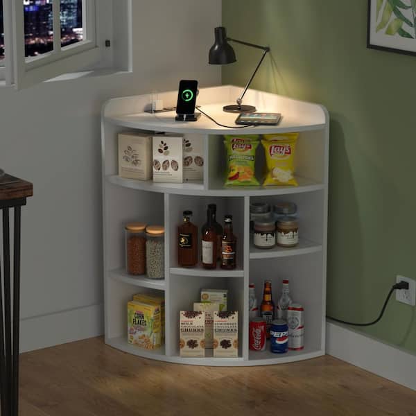 White Corner Cabinet with Charging Station, 3-Tier Cube Storage, USB Ports and Outlets, Triangle Bookcase with 8 Cubbies