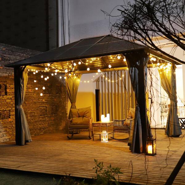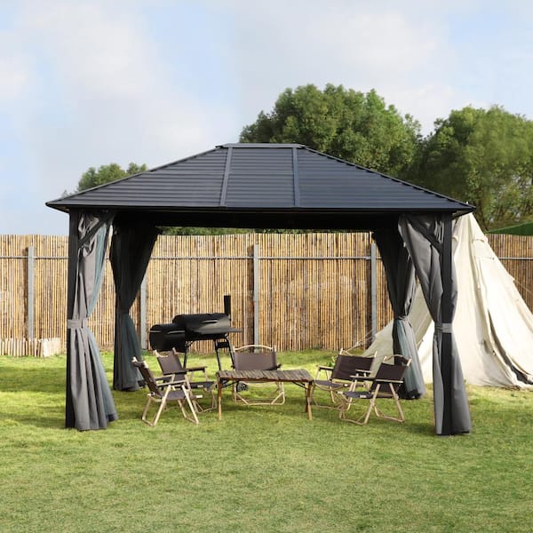 12 ft. W x 10 ft. L x 9 ft. H Aluminum Hardtop Gazebo with Grey Curtains and Netting